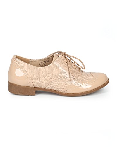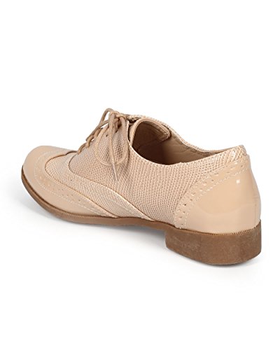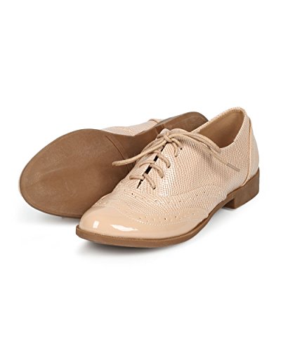 Nature Breeze CH26 Women Patent Snakeskin Wing Tip Lace Up Spectator Oxford - Beige
