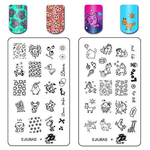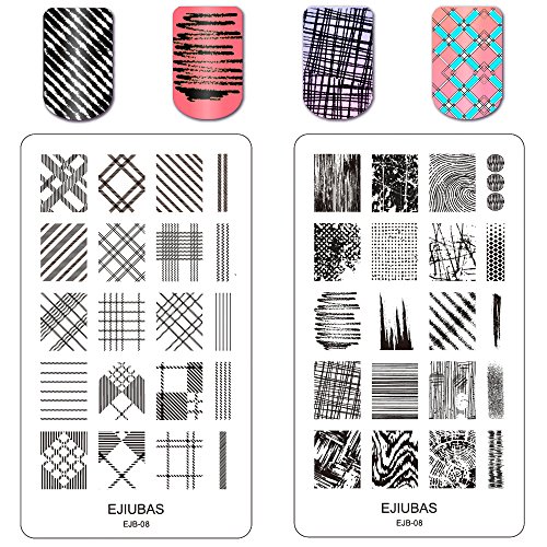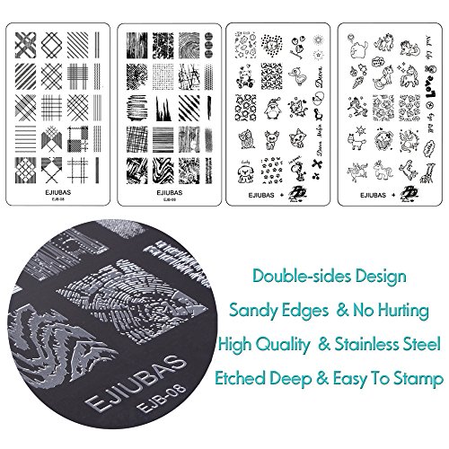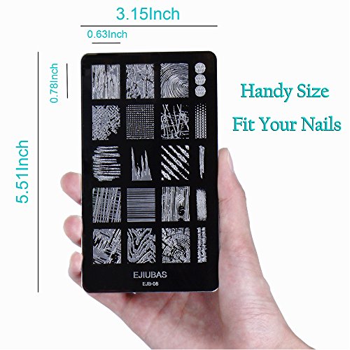 Studio : Ejiubas Publisher : Ejiubas Binding : Misc. Product Description **Feature: √ Suitable Design: Sizes: 8cm X 14cm (3.15 in X 5.51 in),easy to handle and carry, comfortable handling and a protective nylon screen; √ Easy to use for both beginners and experienced nail artists; √ Material: Stainless Steel; √ 2 PC nail design plates; √ Package: Original Ejiubas Box Package, Bubble pack wrapped. √ Package Contents:2 PC Double-side Ejiubas stamping plates; **Instruction. 1. Apply base coat or regular polish on the nail ; 2. Apply the nail polish to desired image within a nail plate ; 3. Make a scraper leaned over 45 degrees and scrape excessive polish off quickly and strongly from inside to outside ; 4. Immediately press the stamper with a gentle rolling motion to pick up the design. The image is transferred on the nail stamp ; 5. Stamp the image on your nail with a gentle rolling motion. The image is transferred on your nail ; 6. Repeat the above steps for all of your nails ; 7. After stamping nail art, apply top coat for lasting wear. ** Note: The plate is shielded by a thin blue protective film; please remove the film before use, so that the nail polish can be transferred by the stamper.After using,use nail remover to clean the nail plates, Convenient use next time. **Warranty: --All Our Products are Produced under Strict Quality Inspection --Easy Return 30 Days Refund Guarantee **Customer service: -Any questions, please contact us through amazon messages, and we will reply in 24 hours. Thanks! 0