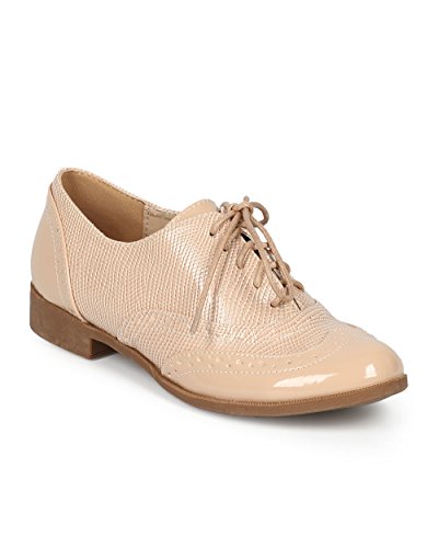 -. Title : Nature Breeze CH26 Women Patent Snakeskin Wing Tip Lace Up Spectator Oxford - Beige