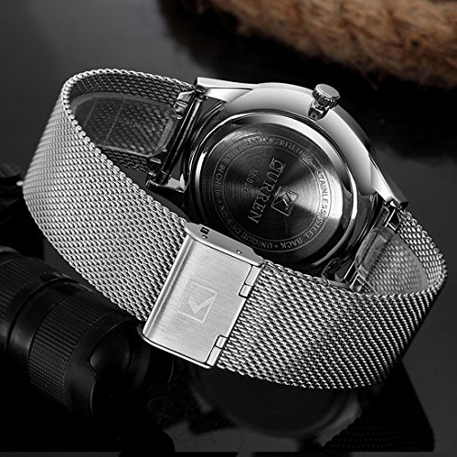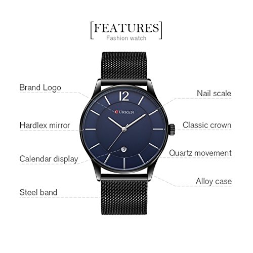 -. Feature : FEATURE:Nail Scale simple & classic business design; Calendar Display to know the date accurately and quickly; Steel mesh band the cold feeling is 30% off than the common steel band which wears in winter / MOVEMEN:Quartz Movement,Case Material: Alloy,Band Material: Mesh Band,Clasp: Hook Buckle,Function: 3ATM,Watch Window: Hardlex / SPECIFICATION:Band Length:230mm,Band Width:22mm,Dial Thickness:9mm,Dial Diameter:42mm, Weight:0.079KG / WARRANTY - 30 days money back guarantee for any reason + 12 months replacement or full refund for quality issues + 24 months maintenance for quality issues