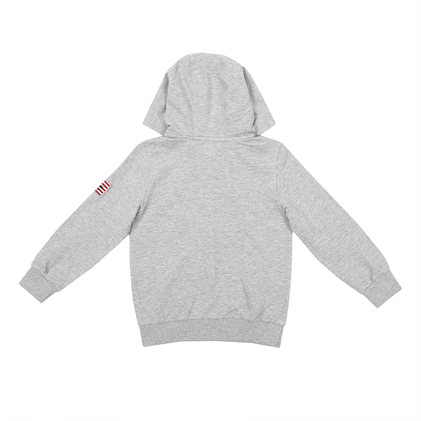 남아용 후드 맨투맨티입니다. 멜란지 바닥에 레드/네이비 컬러 블럭 절개해 로고 패치워크 자수로 포인트를 주었습니다.