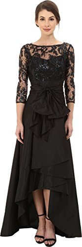 Three-quarter-sleeve gown with sequin lace bodice, tie waist, and draped high/low taffeta skirt