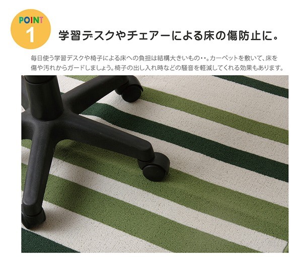 学習机のデスクカーペットとしても使用可能なルームマットです。表地はループタイプになっており、毛足が短く掃除がしやすい仕様になっています。パイル部分には耐久性に優れたポリプロピレン糸を使用しています。ポリプロピレンには、摩擦に強く、遊び毛が出にくいという特長もあります。フローリングを傷つけにくいよう、裏には不織布を貼っています。お子様の学習机の下や、ベッドサイド、ソファ前などにお勧めの商品です。