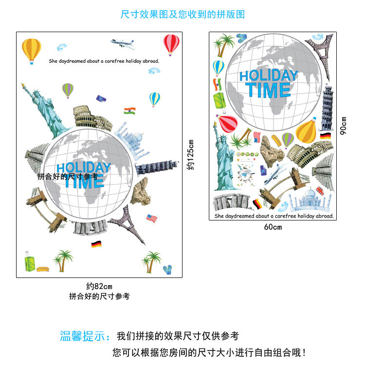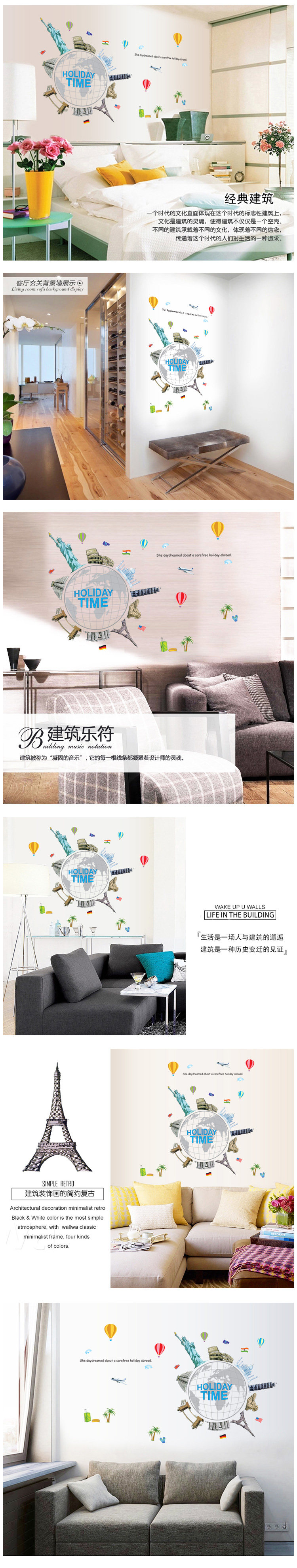可移除墙贴纸墙纸贴画D卧室墙壁温馨装饰客厅电视背景 环球旅行