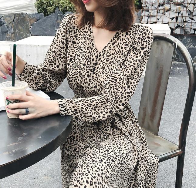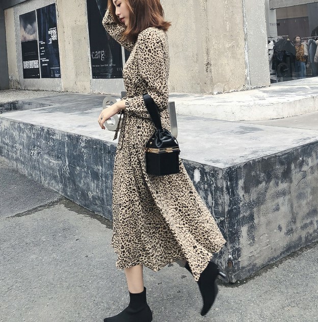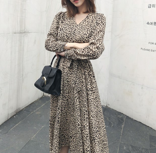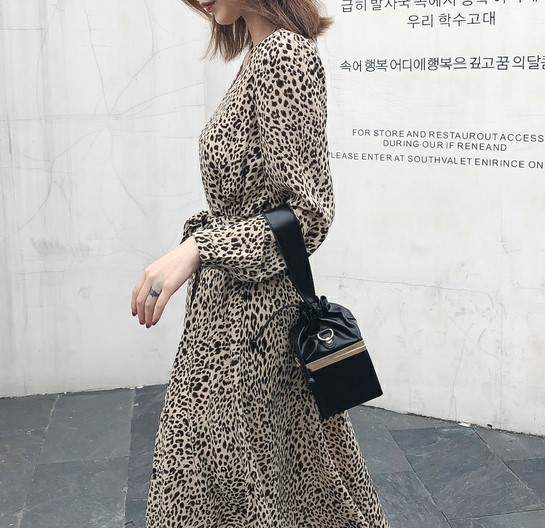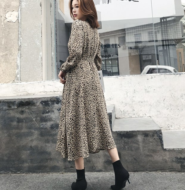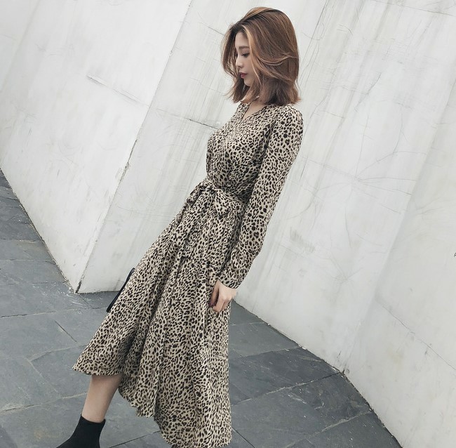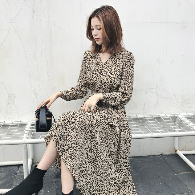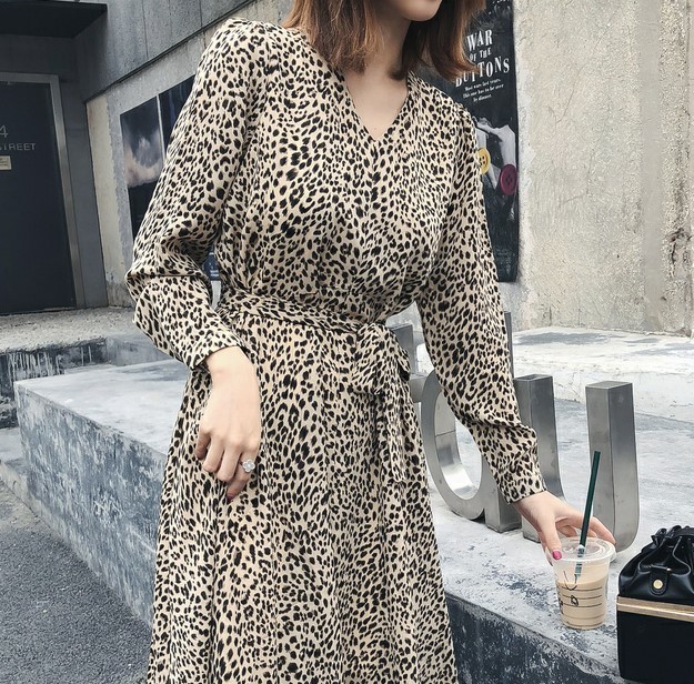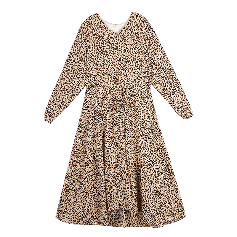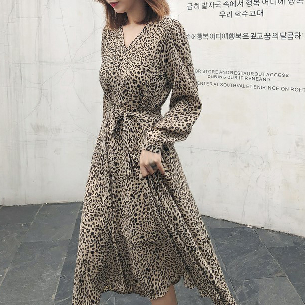 ウエストリボンで美シルエットをメイクするヒョウ柄ワンピース。