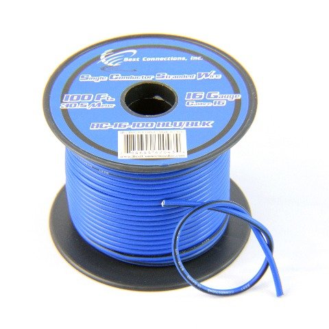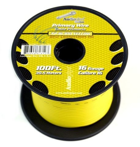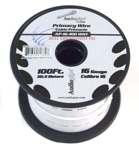 Studio : Audiopipe Publisher : Audiopipe Product Description ***Green, Yellow and White will be sent hand-rolled and not on a spool. White with Black Stripe and Red with White Stripe are out of stock.***Please send us a message regarding the colors of your choice.If no message is received at the time of payment, we will randomly select the colors for you.16 Gauge, 100' FT Remote Wire18 Rolls, 100' FT Each RollSingle Conductor, Remote, Turn on, Hook Up WireStranded Copper Clad AluminumFlexible, Insulated, and Jacketed in PVCPerfect for Car Audio, Home Theatre, AutomotiveUse this with any 12 Volt or home projectRated 158 degrees Fahrenheit (6 to 80 Volts)Colors available: Red, Black, Blue, Yellow, Green, White, Brown, Purple, Gray, Pink, OrangeStriped Tracer Wire Now Available:Black with White Stripe, Blue with Black StripeGreen with White Stripe, Gray with White StripePurple with White Stripe, Red with White StripeWhite with Black Stripe***STRIPED TRACER WIRE IS A BEST CONNECTIONS BRAND AND WILL HAVE THE BEST CONNECTIONS LABEL. ***THIS IS NOT AWG AMERICAN WIRE GAUGE Click here for more available information regarding wire specs