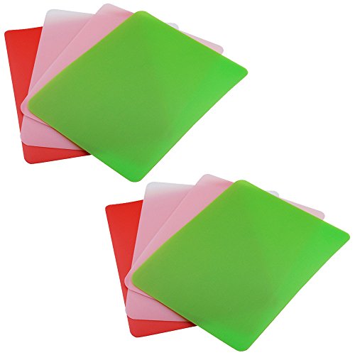 The Good Cook 4-Pack of Flexible Chopping mats increases food safety, keeps your countertops safe from damage, and provides a more compact storage alternative to cutting boards. The color coded mats makes it easy to use one mat with each type of food. Included is red, blue, yellow and white. Red should be used for meat, yellow for poultry, blue for fish, and everything else on white. These mats feature a stain resistant material, and are durable enough for everyday use.Feature