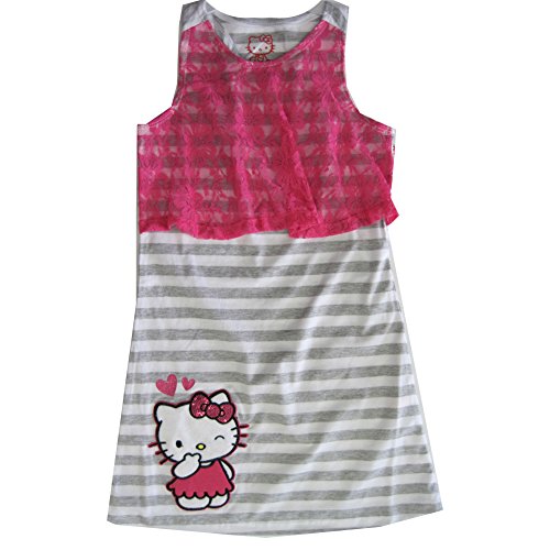 A cute striped dress from Hello Kitty, a great addition to any little girl's wardrobe. The dress features white grey striped pattern with lace overlay on top and a Kitty applique with sparkly sequined bow. Trendy casual item for a Hello Kitty fan!Feature