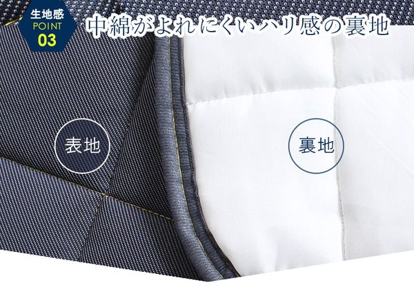 ●表地:ナイロン70% ポリエステル30% 160g/m2、中綿:ポリエステル100% 120g/m2、裏地:ポリエステル100%、中綿吹き出し防止不織布入り