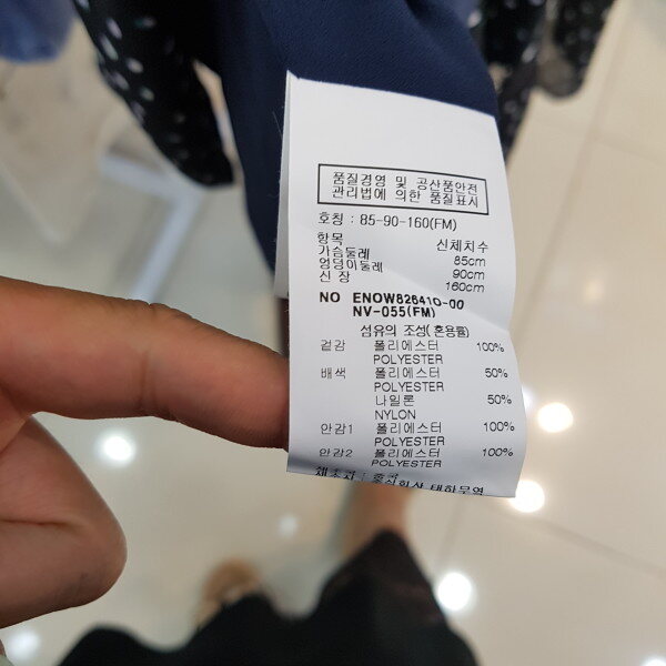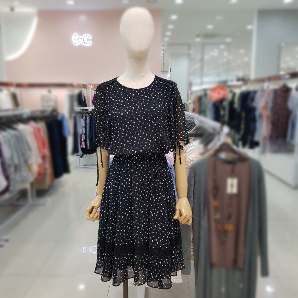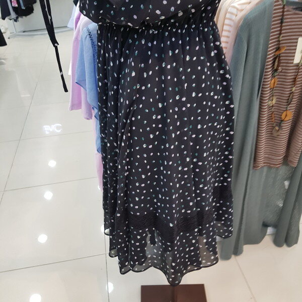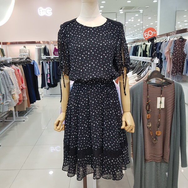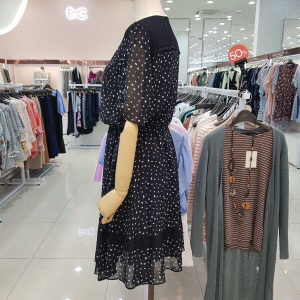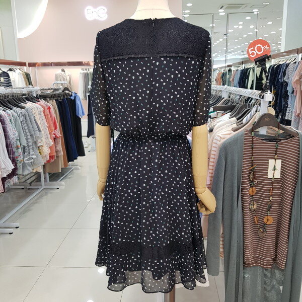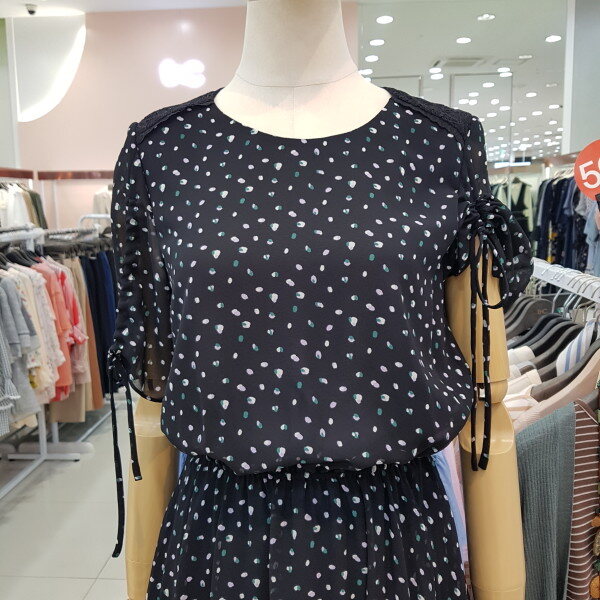 시원해보이는 네이비 바탕에 은은한 도드패턴이 유행없이 입으실수 있으며 어깨부분에 레이스 디테일이 여성스러움을 강조하였습니다