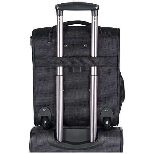 Product Description Lightweight ConstructionDurable 1680D Polyester And Dobby Exterior With Fully Lined Tear-Resistant Polyester InteriorFront Exterior Features Front Zip Down Pocket With Three Zippered Accessory PocketsMain Zip Down Compartment Includes A Garment Panel To Hold Belongings In Place And Two Wet Zipper PocketsSide Exterior Features An Open Elastic Top Beverage / Holster PocketEasy To Lift Padded Top HandleSturdy Bottom Front Feet Keep Bag UprightSturdy Locking Retractable Push-Button Telescopic Trolley Handle Conductive For Simple, One-Handed UseRear Exterior Trolley Strap Fits Over Most Luggage Upright Handles For Hands Free CarryingMeets Most U.S. Based Airline Carry-On Size Requirements And Fits Into Most Airline Overhead Bin Compartments_x000D_ Overall Size: 16.0" H x 13.5" W x 8.25" D_x000D_ Weight: 5.5 lbs 0