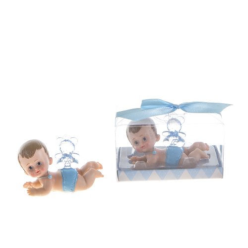 -. Feature : Baby Laying with Teddy Bear on Back Favors - Blue, Set of 12 / Baby laying on tummy with a teddy bear sitting on their back / Comes encased in an appealing gift box with clear plastic front and a satin ribbon bow / These favors are designed for gifting right out of the box and will leave an everlasting memory on your guests / Made of Poly Resin