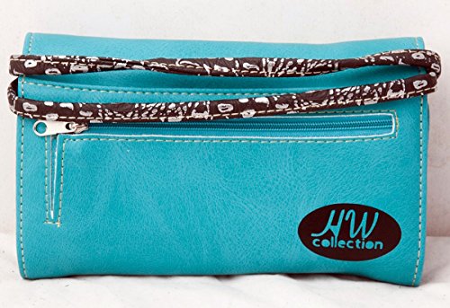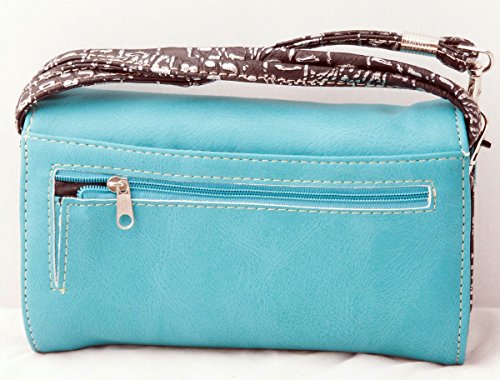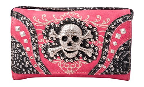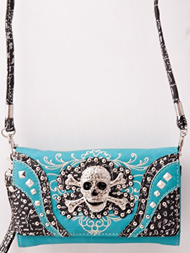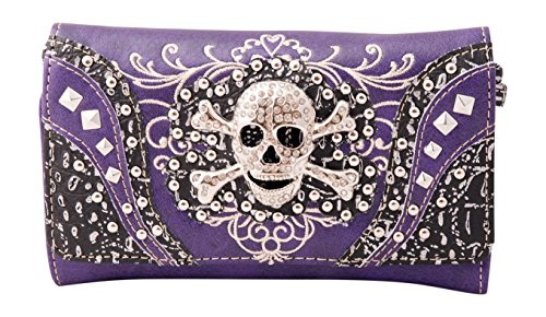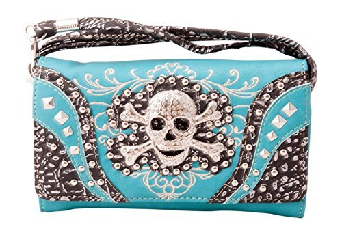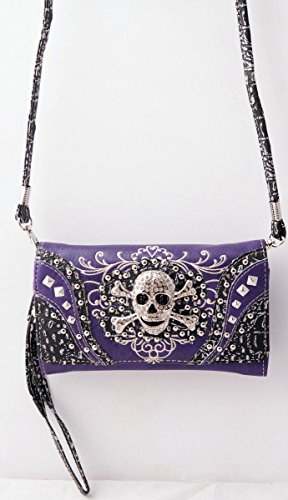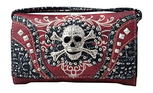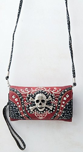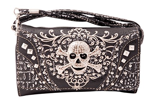 Product Description Western crossbody style wallet/wristlet/clutch is made from high quality premium faux/imitation leather with decorated with silvertone studs, embroidery and large eye-catching rhinestone silvertone skull on the front. Single, removable strap to convert the trifold wallet into a wristlet and a single, long removable shoulder/crossbody strap. Snap closure. Flat currency compartments, expanding accordion area for coupons or receipts and a zippered pocket on the inside for coins. 9 slots on the inside for credit cards, ID, or business cards and 3 clear ID windows. Zippered and slide pocket on the back. 7.5 inches long X 1.5 inches wide X 4.5 inches tall. Aside from use as a wallet, it is great for occasions when you don't want to carry a big handbag and just want to bring the essentials so by using one of the straps you can be hands free! 0