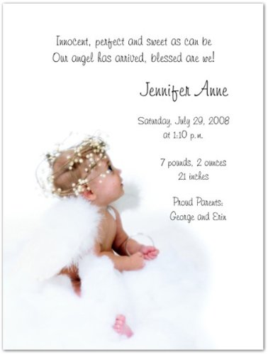 Studio : Storkie Express Publisher : Storkie Express Binding : Baby Product Product Description Birth Announcements: "Angel" features an angelic baby wearing a halo of white berries and white feathered wings. On the white background, the baby holds a silver ring 0