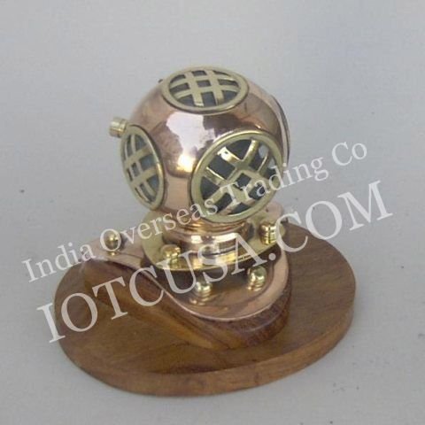 Miniature Replica Diver's Helmet in Copper Brass Trim and Hardwood Base