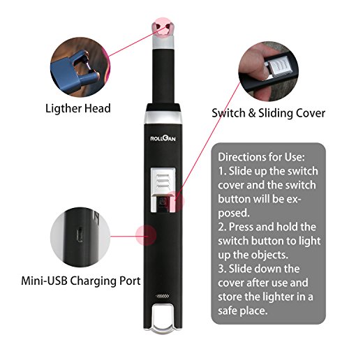 Product Name:Arc Lighter Brand: Rollgan Material: ABS Color: Black Battery: Included Product Dimensions: 9.7 × 2.8 × 1.2 inch Item Weight: 5.4 ounces The Electric Arc Lighter is one of the most popular flameless lighters on Amazon. It features a sturdy aluminum case and a retractable alloy lighting head. You can activate the lighting head by simply sliding up the switch cover and pressing the button underneath. The lighting head produces electric sparks and requires no lighting fuel at all. You can also slide down the switch cover to retract the lighting head when not in use. The lighter has a safety mechanism that only allows the lighter to produce sparks for 12 seconds each time. The lighter is partly pre-charged so you can use it right out of the box, and it also comes with a USB cable for recharge use. How To Use Step 1. Slide up the switch cover and the switch button will be exposed. Step 2. Press and hold the switch button to light up the objects. Step 3. Slide down the cover after use and store the lighter in a safe place Package 1 × ARC Lighter 1 × USB Cable 1 × Gift Box 0 |