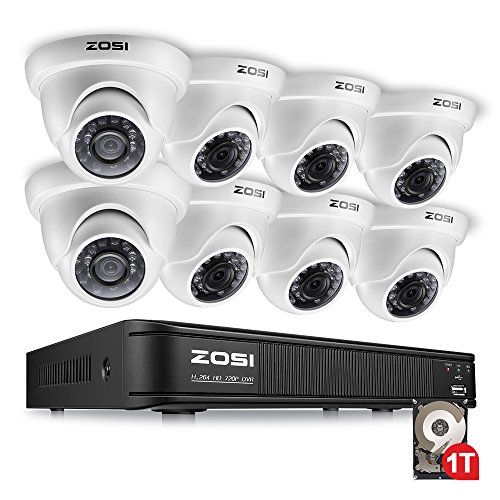 ZOSI 720P AHD Home Security Camera System ,8CH AHD CCTV DVR with Built-in 1TB Hard Drive + 8PCS 1280TVL Waterproof Dome Surveillance Cameras,QR Code Quick Scan Remote Access Viewing