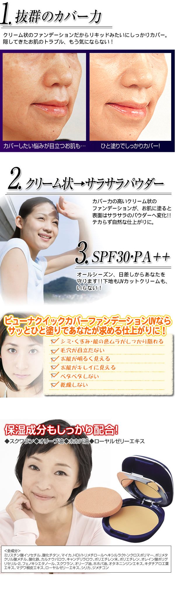 "Beauna Quick Cover Foundation UV Refill Ocre 12 g" is a solid cover like a liquid, it is a cream foundation with outstanding cover power that does not matter the troubles of the skin hidden.