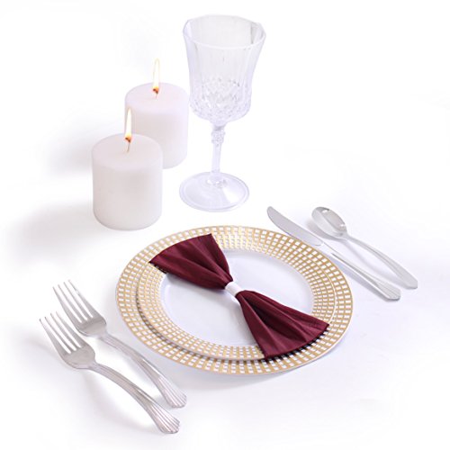 - Elegant disposable place settings for 120 people premium heavy weight round china like plastic plates, white with gold checkerboard border