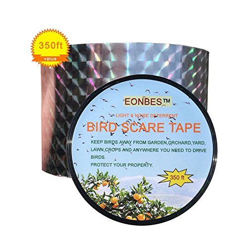 -. Feature : Improved bird deterrent tape, 350 feet per roll,2 inches wide. More effective. / Double-sided reflective tape, light & noise deterrent, no harm to birds. / Keep birds away from your garden, orchard, yard, lawn, crops and anywhere you need to repel birds. Protect your property. / Easy to use scare tape. Hang in strips or lay flat anywhere with the length you need. / Valued bird tape, Well packaging.