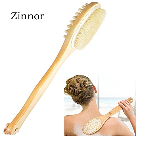 Zinnor Double Faced Dry Bath Bamboo Healthy Body Brush - 100% Natural Bristle Shower Brushes with Long Handle-Exfoliating Scrub Skin Brush- Dry or Wet...
