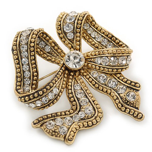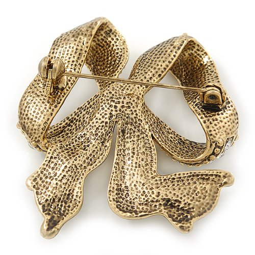 Wrap up the season's hottest looks with this pretty bow pin. Wavy rows of sparkling crystal accents give your look the perfect finishing touch. Pinned to an oversized lapel, fastened to your favourite scarf or even clipped on your purse for a bold glamour look, you can't go wrong with its easy elegance. The brooch crafted in antique gold metal and garnished with clear crystals. It measures about 50mm L x 45mm W, and fastens with a bar/swivel clasp.Feature