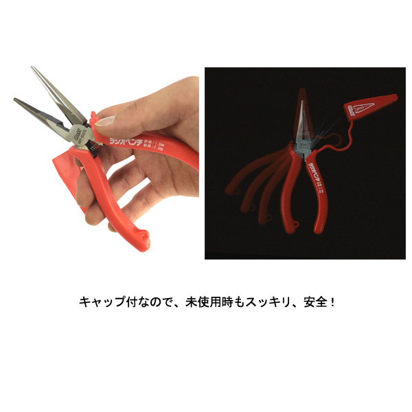 ●シンプルなフォルムをベースにスプリングをつけて機能性をアップし、セーフティにお使い頂けるようキャップを先端につけたラジオペンチです。本体とキャップがループでつながっているので紛失せず、邪魔な時は簡単に切り離せる設計になっています。
