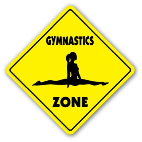 - Features a yellow yield style sign that says: "Gymnastics Zone" with a gymnast doing a split
