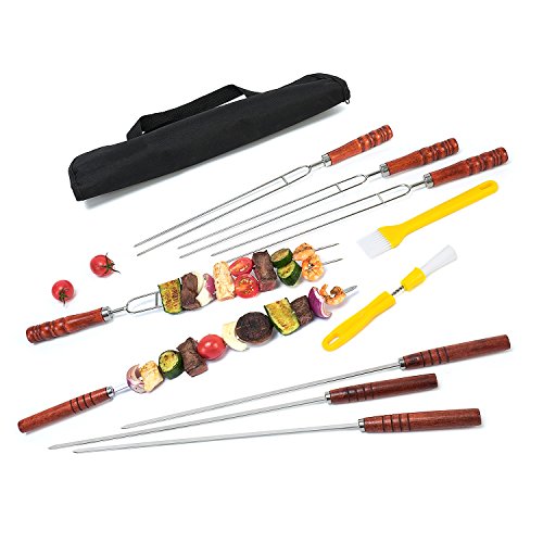 Monbix SK-70710 1/4 Inch Flat & U-Shaped Stainless Steel Kabob Skewers Each has 4Pcs, 16.5 Inch BBQ Skewers with Wooden Handle, Comes with Multi-Function Basting Brushes and Handy Storage Pouch