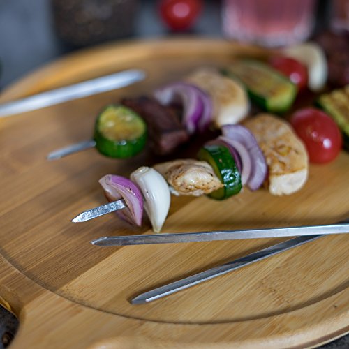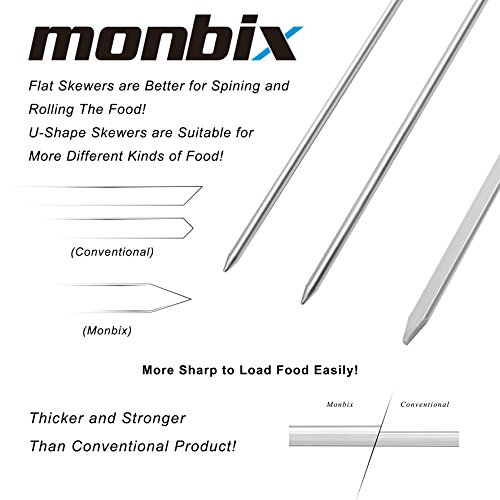 【User Friendly Design】 Flat & U-Shape skewers each has 4Pcs, these will help you to spin and roll your food more easily, and our skewers are more sharper to load food easily. These can help you meet all grilling needs. (U-shape skewers 16.5" L, 9" for food, flat skewers 16.5" L, 11.5" for food)