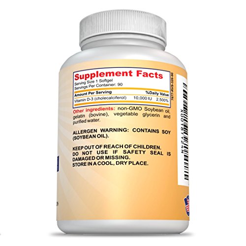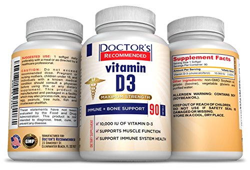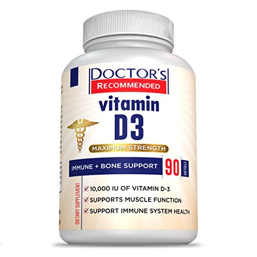 -. Feature : ★WHAT IT IS: Doctor's Recommended 10,000 IU of Vitamin D3 produces and delivers to your body the same biologically active form of vitamin D as produced by the sun. Daily intake of D3 is crucial to maintaining strong bones and muscles as well as playing a vital role for overall heart, colon, prostate, breast, immune and dental health. Our doctor's Recommended formula provides a maximum strength 10,000 IU of high potency vitamin D3 for a better & healthier YOU. / ★OVERCOME DEFICIENCY: Your body needs to maintain healthy vitamin D levels between 50-80 ng/ml. Our 10,000 IU high potency vitamin D3 is designed to achieve those levels while being extremely effective in keeping you in that optimal range. / ★WHY US: The Doctor's Recommended community is fully committed to bringing YOU the highest quality, research-grade products that maximize results more effectively than any of our leading competitors. Your body will be healthier as a result of our supplements, otherwise we are not doing our job correctly. / ★100% PURE QUALITY MADE IN THE USA: All of the products in our Doctor's Recommended community are made under strict GMP standards in our FDA Certified Lab, assuring that we bring you only the purest and most effective ingredients available on the market. 100% MONEY BACK GUARANTEE