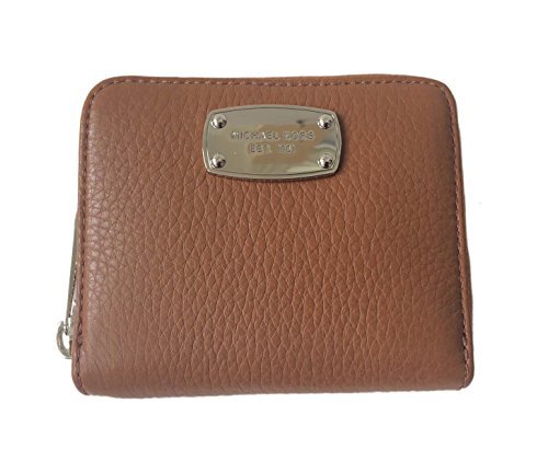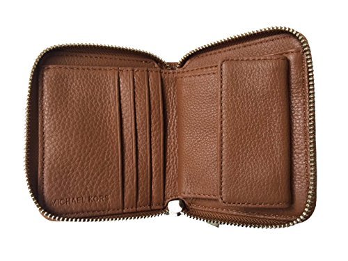 Wrapped in Michael Kors soft luggage brown full grain pebbled leather with polished silver tone hardware. This zip around style bifold wallet is accented with a Michael Kors nameplate on the front which has been updated for 2015 with an elevated profile and rounded corners. It has a leather and signature nylon interior that features 4 credit card slots, a full length bill compartment along the upper edge, and a coin compartment that snaps shut. There is also a small slip pocket behind the snapped pocket. It measures approximately 4 inches (L) x 3.5 inches (H) x 1 inch (W).Feature