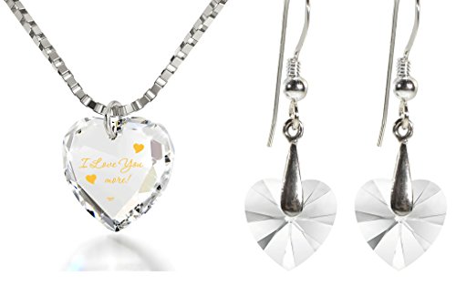 I Love You more necklace and Swarovski crystal heart drop earrings jewelry set. Illuminate love with this divine tiny heart necklace, beautifully inscribed in 24k gold with 'I Love You More' onto a white crystal Swarovski heart-shaped pendant. This romantic heart charm necklace, is beautifully inscribed using innovative technology, allowing us to write the smallest of text on the surface of the gemstone. The elegant heart shaped Swarovski white crystal stone measures just 0.4x0.5in (10x12mm), while gracefully dangling from a gold filled or 925 sterling silver box chain, measuring 18" (45cm). The romantic charm is sturdily attached to a gold plated or 925 sterling silver jump ring. The incredible love necklace is paired with elegant white swarovski heart crystal earrings measuring 0.4 inches, 10mm, while set in a 925 sterling silver or gold plated pinch bail and measure 1.25 inches, 3.3cm in length, including the 925 sterling silver or gold filled fish hooks. (Please note that only the necklace contains the 24k gold inscription). Size doesn't matter where love blossoms, a small charm with bountiful gesture. If you can't say it enough, show it, with this enchanting, romantic anniversary, valentines day or birthday gift idea. Sure to leave a lasting impression, this elegant charm necklace makes a great gift for any loved one; your wife, girlfriend, best friend, mother or a special treat just for you!Feature