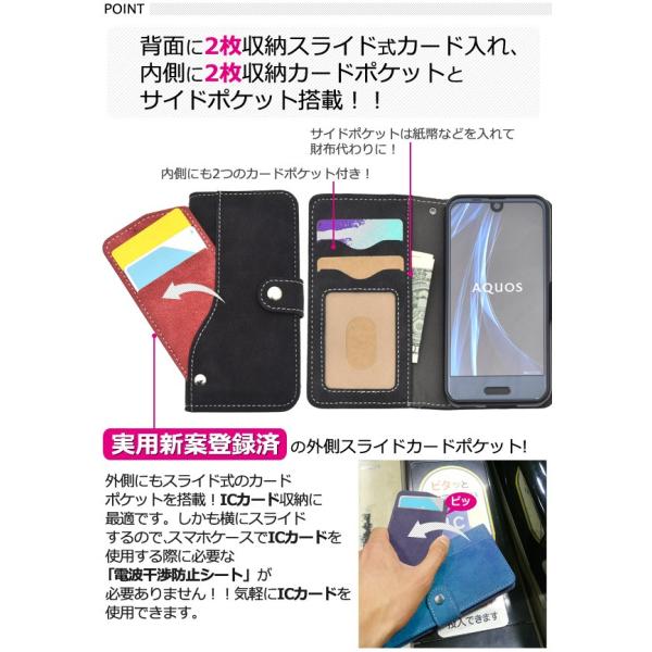 | 商品の説明 | 背面に2枚収納スライド式カード入れ、内側に2枚収納カードポケットとサイドポケット搭載した、 スライドカードポケット ソフトレザー手帳型ケース。 背面にもスライド式のカードポケットを搭載!(実用新案登録済) ICカード収納に最適です。 しかも横にスライドするので、スマホケースでICカードを使用する際に必要な 「電波干渉防止シート」が必要ありません!!気軽にICカードを使用できます。 滑らかな手触りソフトレザーデザイン。持つ度に手にしっくりと馴染みます。 背面を折り返すとスタンドとして使用できるので、動画視聴に便利です。 落下防止に便利なストラップホール付きです。 横開きタイプなので、手帳のように使うことができます。 しっかりと固定できるスナップボタン式を採用!マグネットタイプではないので クレジットカードなどの磁気カードも収納できます。 ※スマートフォンは付属しません。 ※ライセンス商品ではありません。 |