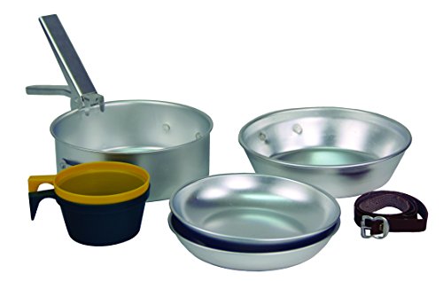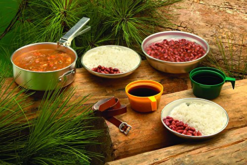 - Set includes: 7" Fry Pan, 6-1/2" Cook Pot, Two Soup Plates, Two 8 oz. Plastic Cups and a Detachable Aluminum Handle
