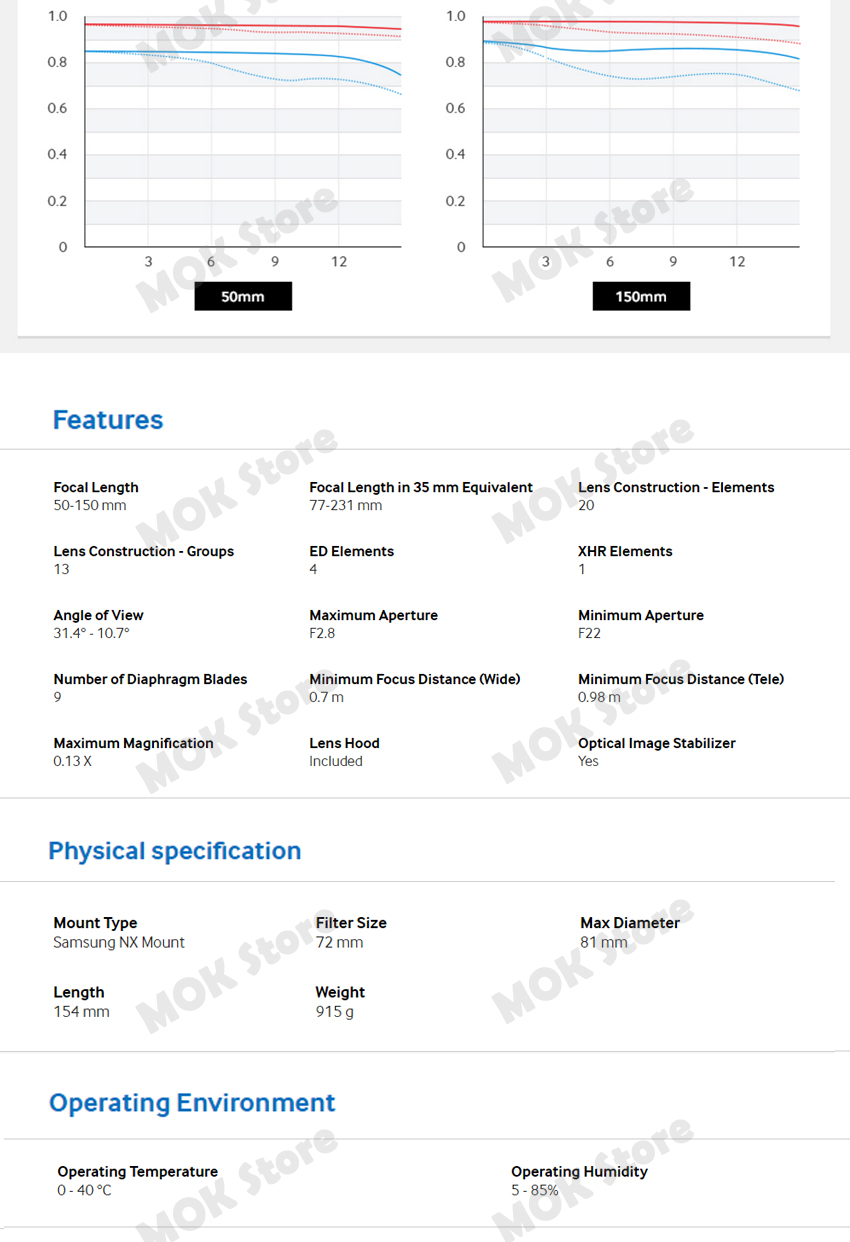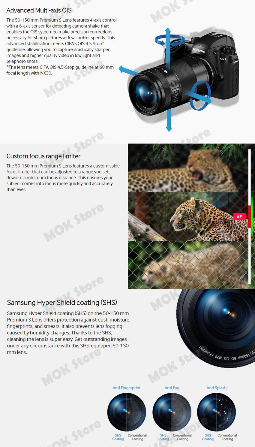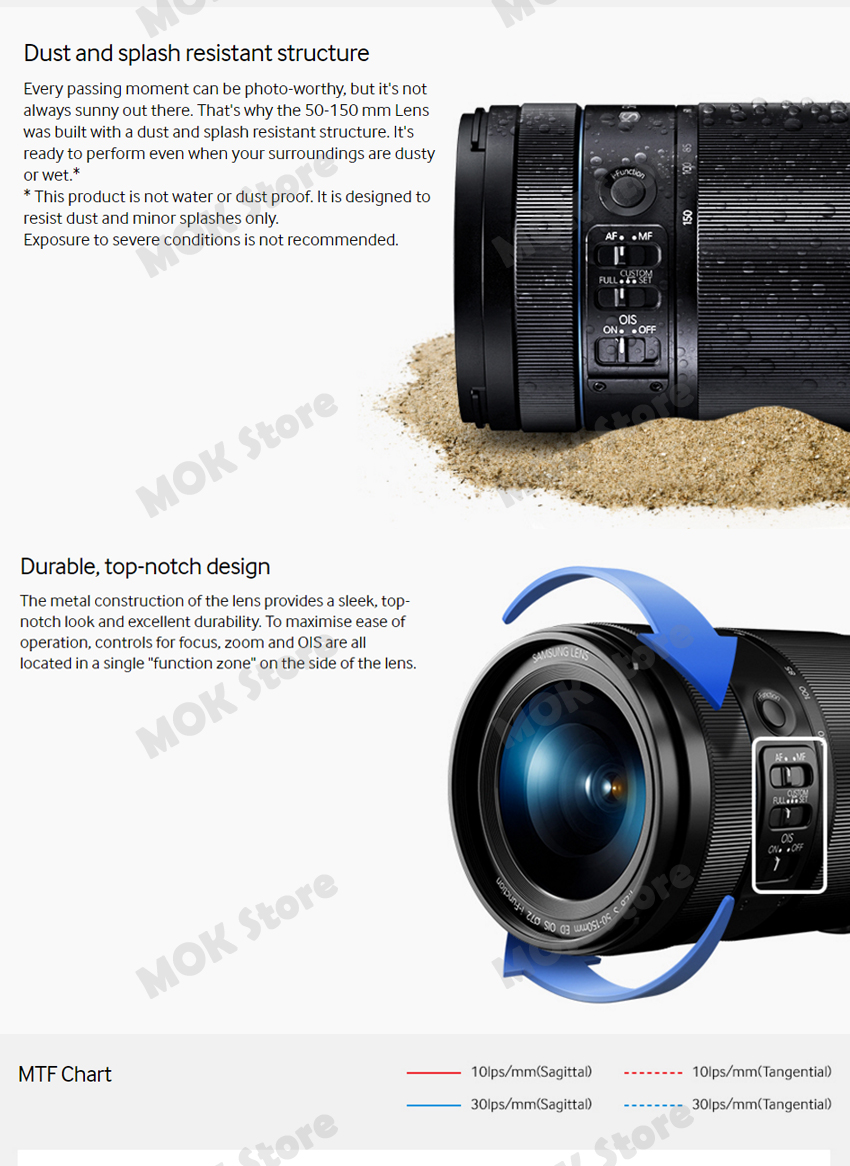 Samsung Hyper Shield coating (SHS) on the 50-150 mm Premium S Lens offers protection against dust, moisture,