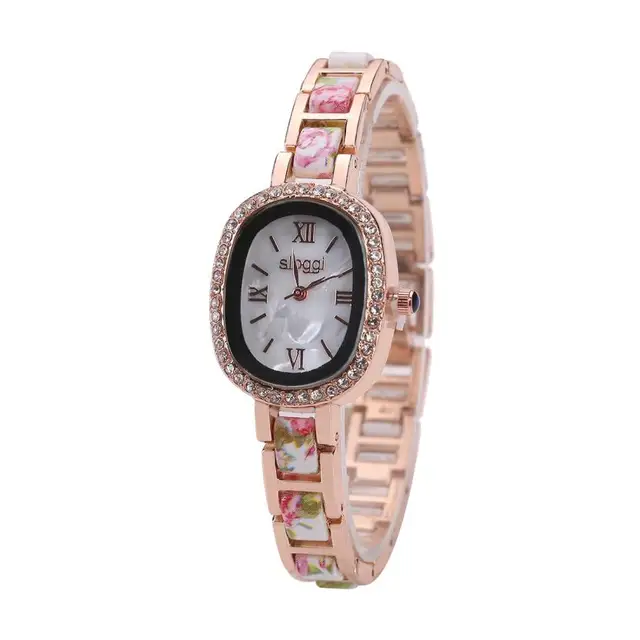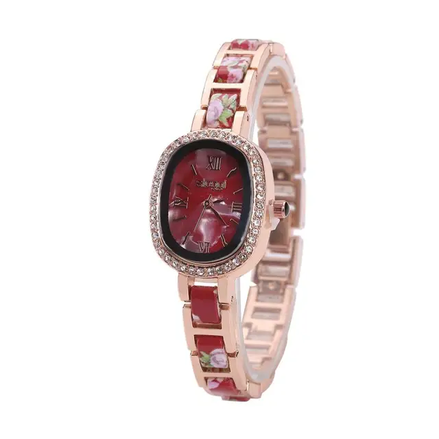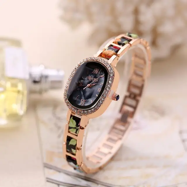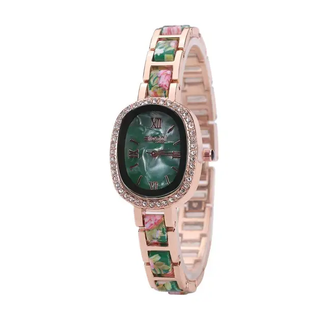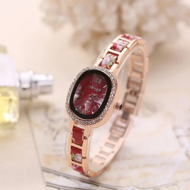 여성 타원형 쉘 꽃 전체 다이아몬드 팔찌 시계 아날로그 석영 운동 손목 시계