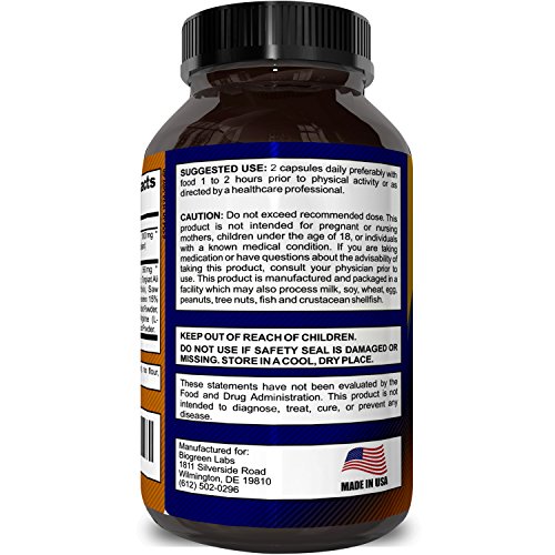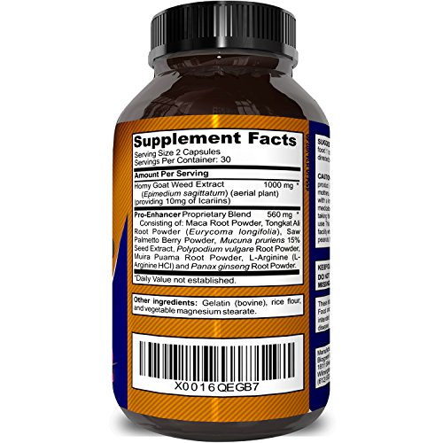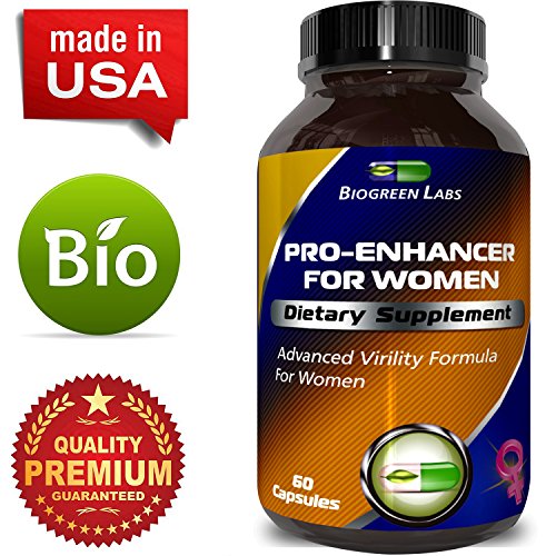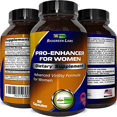 Give your sex drive a natural boost with these pure and potent female supplements to increase libido and sexual performance from Biogreen Labs. With 1000 mg of natural Horny Goat Weed, containing 10 mg Icariin, these pills will help women everywhere receive the boost they want without consuming any unnatural chemicals. Also contained in these capsules are maca root powder, tongkat ali, muira puama root powder, l-arginine, panax ginseng root powder and saw palmetto. Ginseng will help to boost the immune system and fight off the symptoms of ill health, all while improving concentration and giving people more energy - while tongkat ali can aid in to build muscle quickly as well as burn belly fat. Saw palmetto is also a diuretic, which helps users to lose that bloated feeling and lose weight quickly. Taking two pills per day, with meals, an hour or two before physical activity will help increase libido and sex drive. This product is manufactured and packaged in a facility that may handle shellfish, milk, fish, soy, tree nuts, wheat, peanuts and eggs. Keep these supplements out of the reach of children, and do not use if the safety seal is missing.Feature