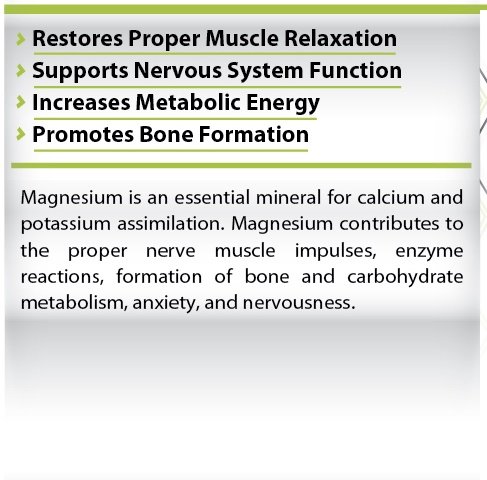 Magnesium Citrate has been suggested to restore proper muscle relaxation, support nervous system function, increase metabolic energy and promote bone formation.Magnesium Citrate is an essential mineral for calcium and potassium assimilation. Magnesium contributes to the proper nerve musle impulses, enzyme reactions, formation of bone and carbohydrate metabolism, anxiety and nervousness.