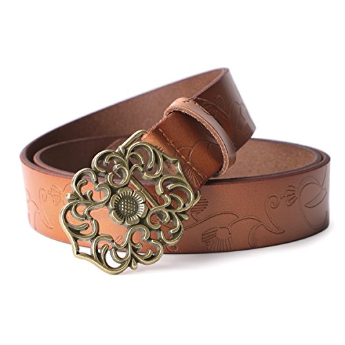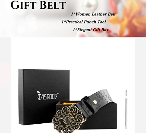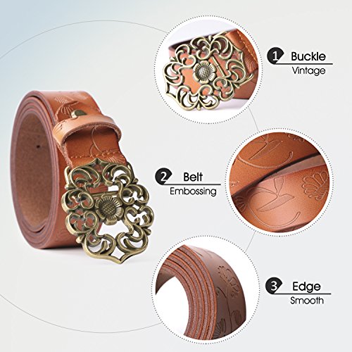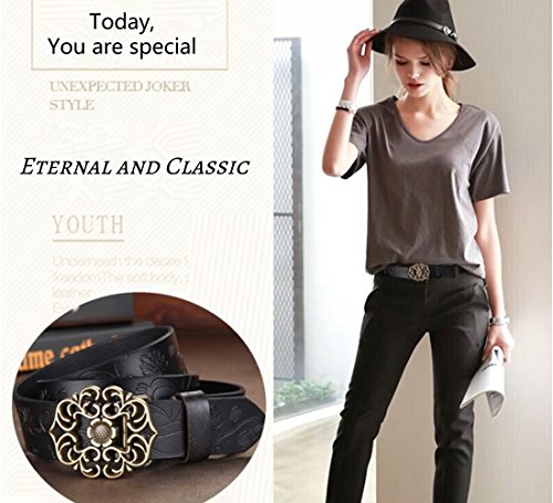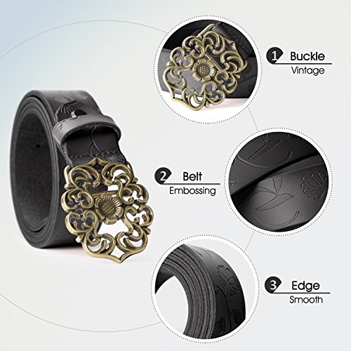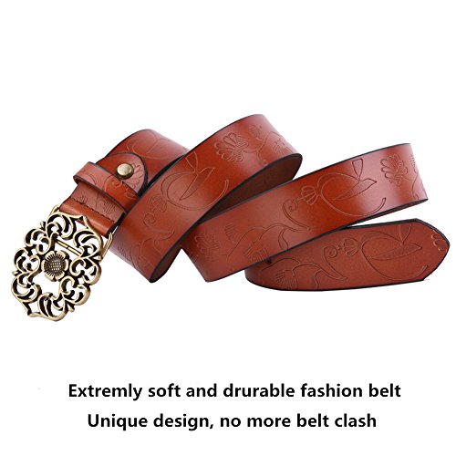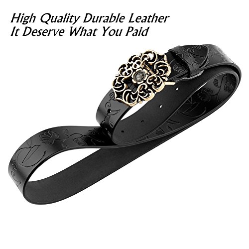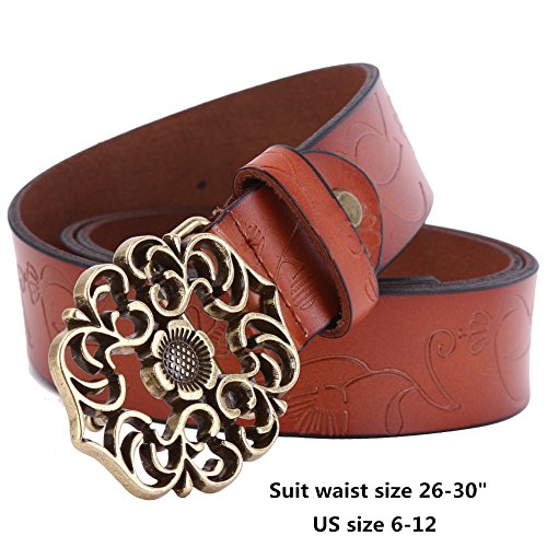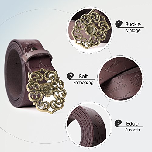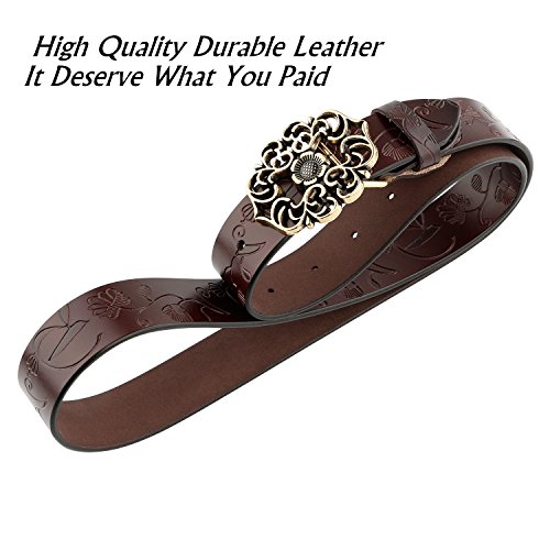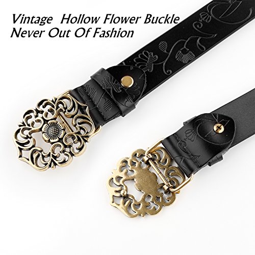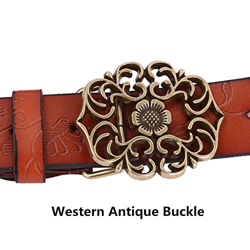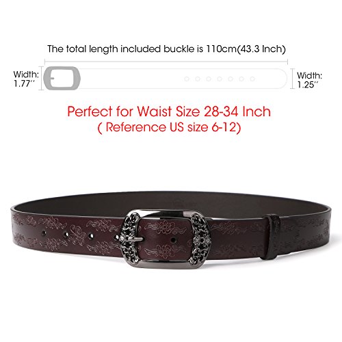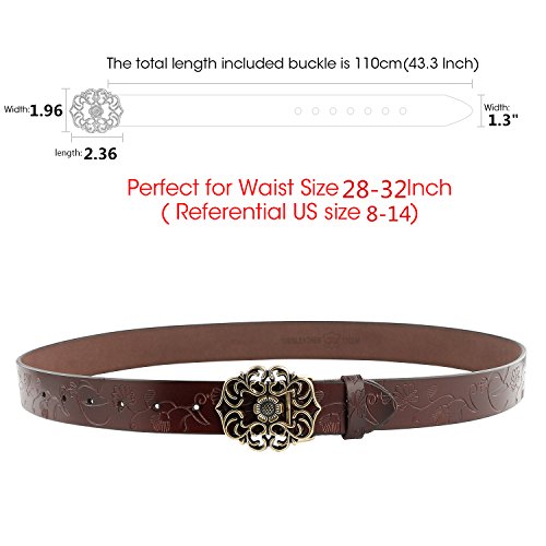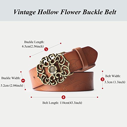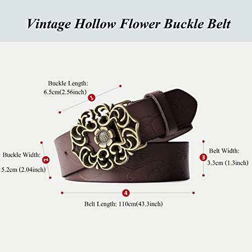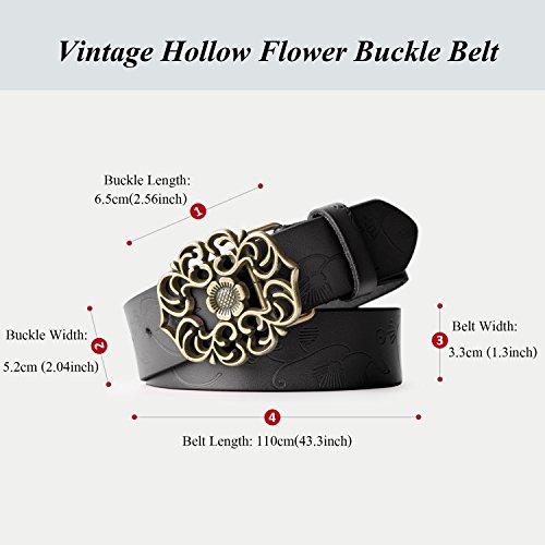 Western Leather Belt For Women Product Features: 1.Belt Size:The total length included buckle is 110cm(43.3 Inch) Width:3.3cm(1.3Inch),Perfect for Waist Size 28-32 Inch( Referential US size 8-14) 2.Buckle Size:length: 6cm(2.36 Inch),Width:5cm(1.96Inch). 3.Material: Genuine Leather Vintage Hollow Out Flower Buckle. 4.Unique and fashion design,More Comfortable and Durable 5.Awesome casual accessory for indoor and outdoor activities.
