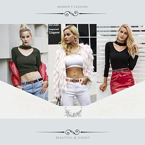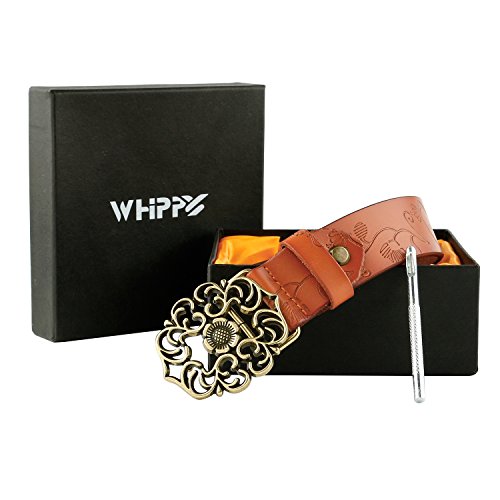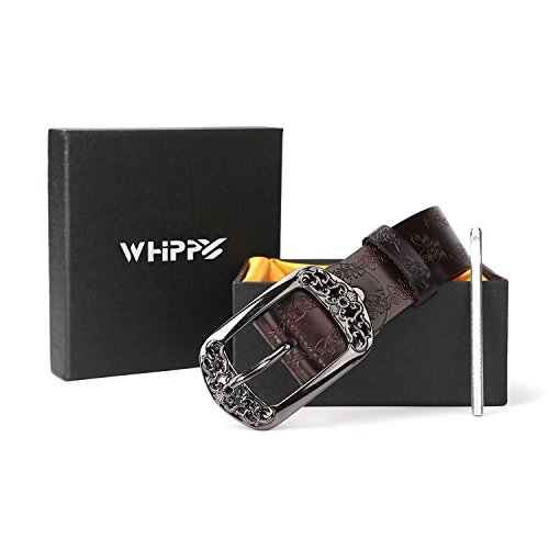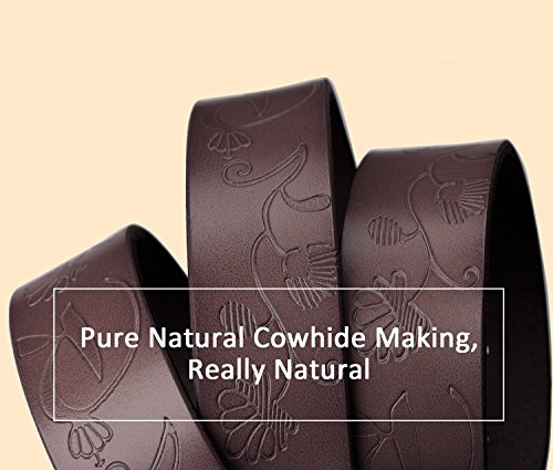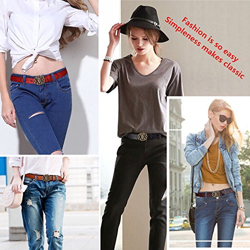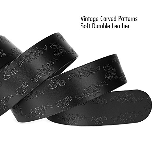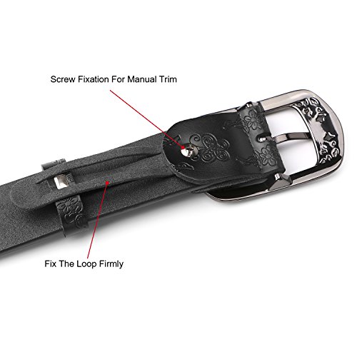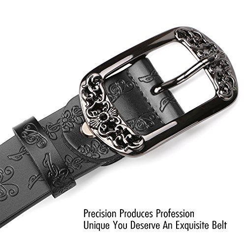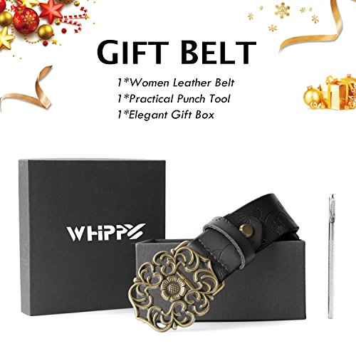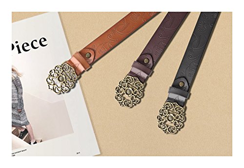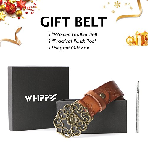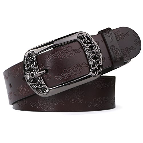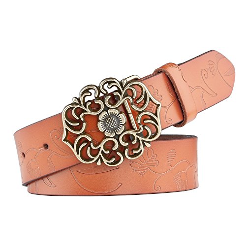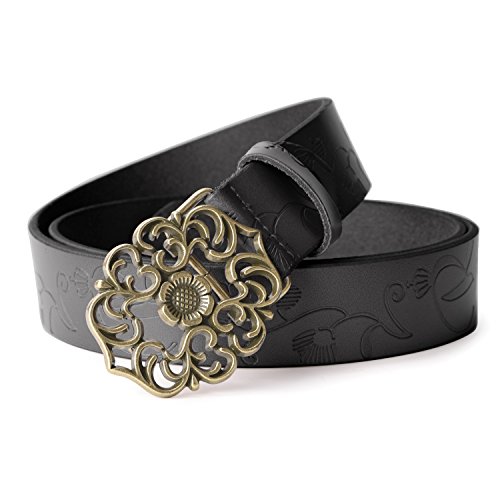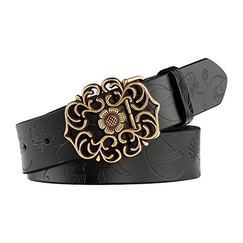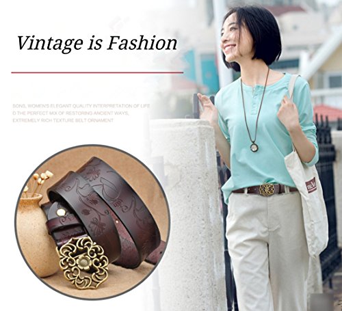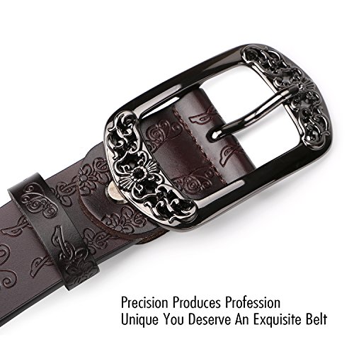 Western Leather Belt For Women Product Features: 1.Belt Size:The total length included buckle is 110cm(43.3 Inch) Width:3.3cm(1.3Inch),Perfect for Waist Size 28-32 Inch( Referential US size 8-14) 2.Buckle Size:length: 6cm(2.36 Inch),Width:5cm(1.96Inch). 3.Material: Genuine Leather Vintage Hollow Out Flower Buckle. 4.Unique and fashion design,More Comfortable and Durable 5.Awesome casual accessory for indoor and outdoor activities.