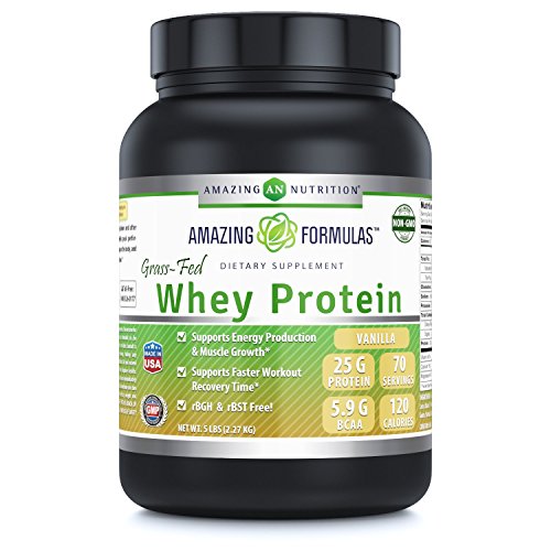 Amazing Formulas Grass-fed Whey protein powder is made from milk produced by cows that are pasture grazed on grass and organic feed. Organic Whey protein has a complete profile of amino acids that are needed for so many important jobs in the body. This product comes in a 5 LBS jar offering approximately 70 servings with 25 grams of protein in each serving.