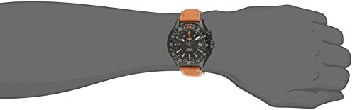 This analog men's watch features a brown leather strap and black dial. It also comes with Intelligent QuartzTM 3 GMT movement, 2nd & 3rd time zones, genuine leather strap and 100 meter water resistance.