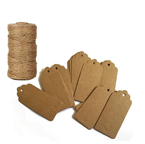 TIAMALL 100PCS Kraft Paper Gift Tags Bonbonniere Favor Rectangular Gift Tags with Free 300 Feet Natural Jute Twine