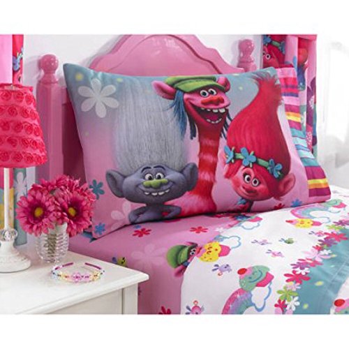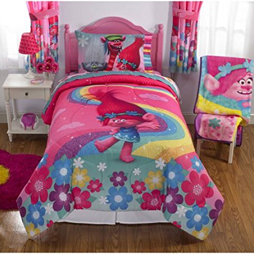 Studio : Franco Manufacturing Co. Inc. Publisher : Franco Manufacturing Co. Inc. Product Description Trolls complete bed in a bag twin bedding set will bring fun to any girls room. Set includes reversible microfiber comforter, sheets and standard pillow case. The twin comforter is reversible with assorted Trolls characters, rainbows, flowers and cupcakes. Decorative print with bright pink and blue colors. Cute smiling Poppy with Branch, Cooper and Guy Diamond. Trolls print from the DreamWorks movie, games and toys. High quality microfiber 100% polyester. Machine wash. Made for twin bed. 0