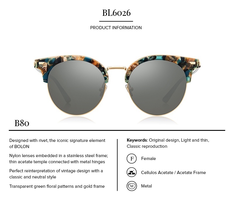 Designed with rivet, the iconic signature element of BOLON, these sunglasses have nylon lenses embedded in a stainless steel frame. Thin acetate temples are connected with metal hinges, enhancing the classic and neutral style. A real reinterpretation of vintage design with a MULTICOLOR and BROWLINE style shape. Feature a GREY color MIRROR and UV 400 protection lenses to ensure a maximum comfort all day long. Comes with a free premium black leather protective case & a branded cleaning cloth. One tips: order it before it is sold out!