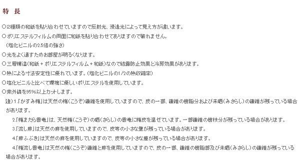 | 和紙本来の特性である吸放湿性、吸着性、断熱性を備えながら、破れない強度とでんぷん糊で貼れる特長を併せ持つ「人と建具にやさしい」素材。和紙の素材である靱皮繊維(じんぴせんい)を使用。本物テイストを味わう演出に。 |