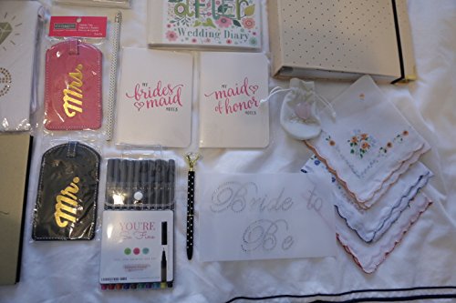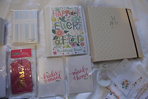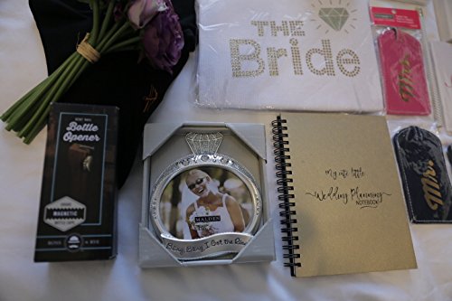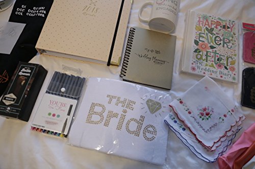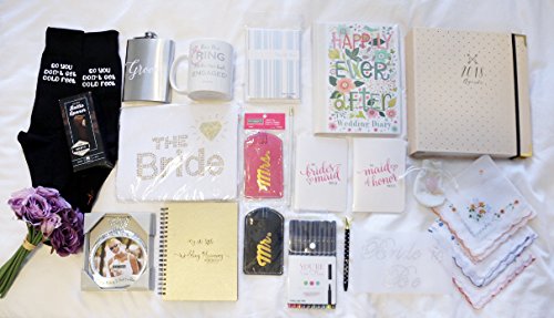 Engagement Welcome Kit - 2018 planner, wedding notebook and keepsake, bride tank top, groom socks and flask, mug, diamond pen, pen set, hankies, rose...