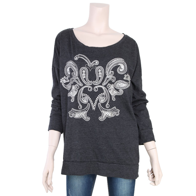 앞판의 자수프린트가 고급스러운 포인트로 자리잡은 루즈핏의 롱티셔츠입니다