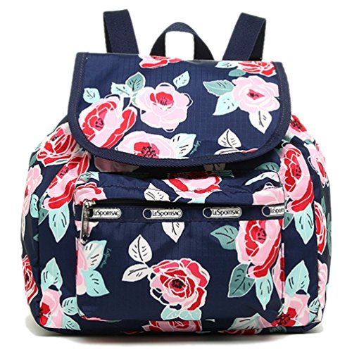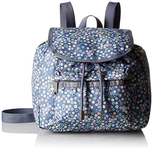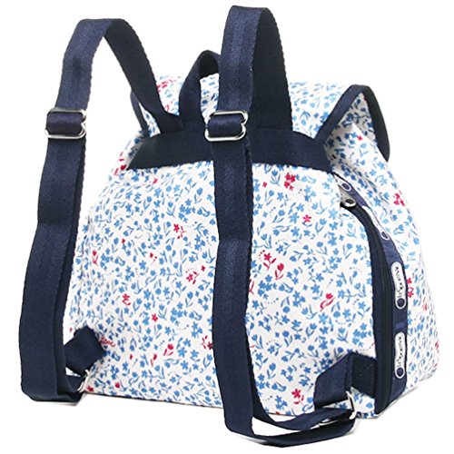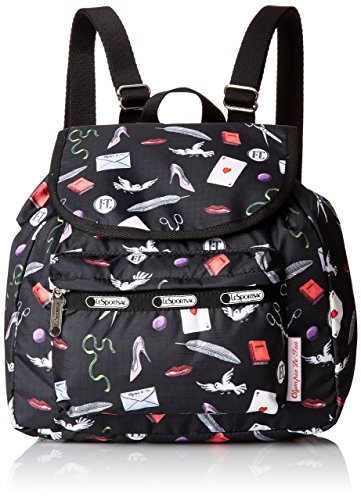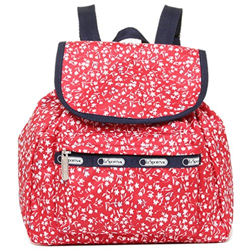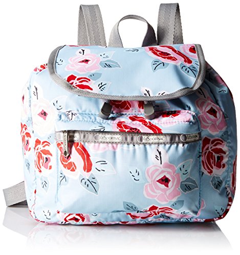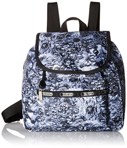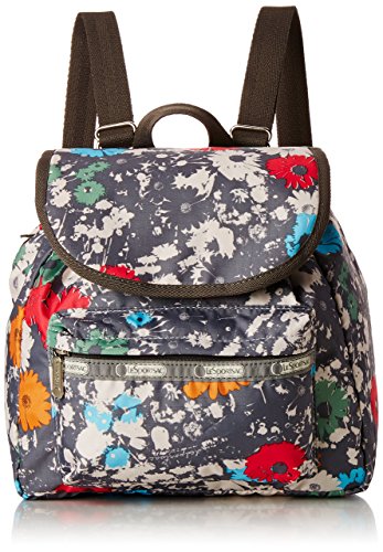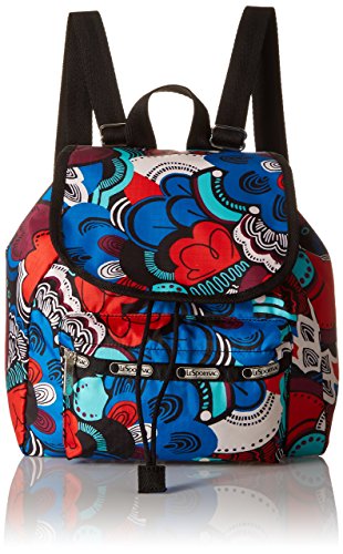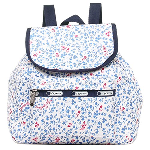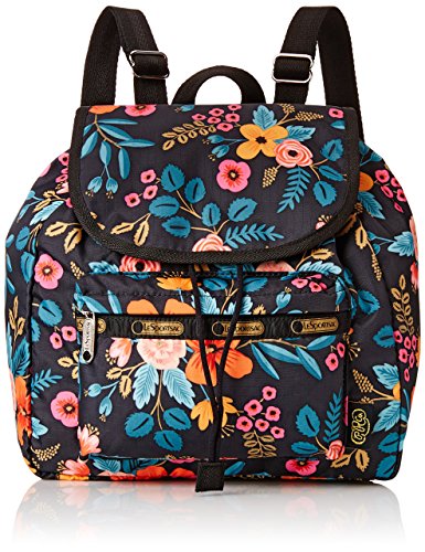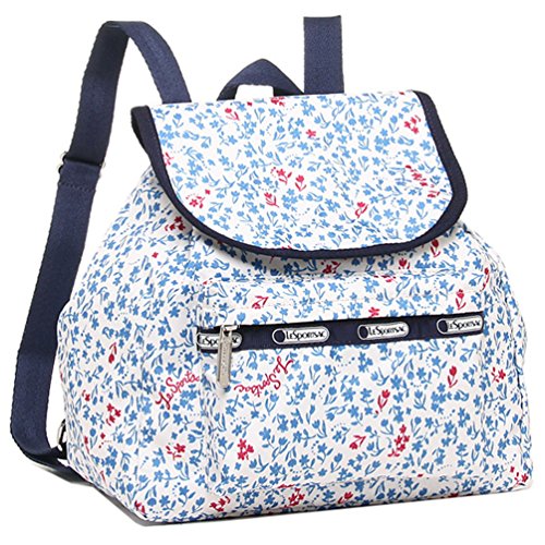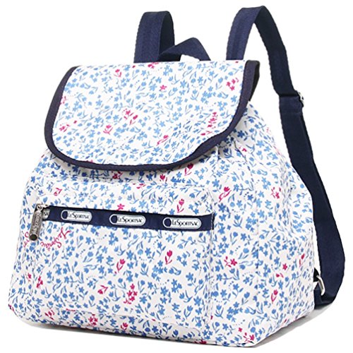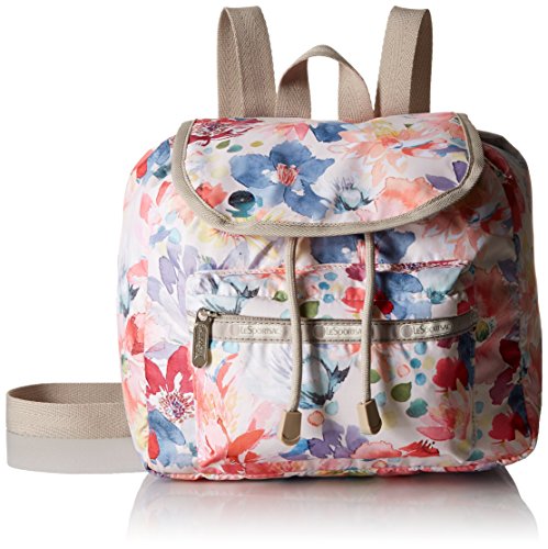 A scaled-down Liberty for LeSportsac backpack with a mix of floral prints. The magnetic top flap lifts to reveal the drawstring-cinched top line. Lined interior with 1 zip pocket and 1 patch pocket. Exterior pouch pocket. A back zip opens to the interior for easy headphone access. Locker loop and adjustable shoulder straps.